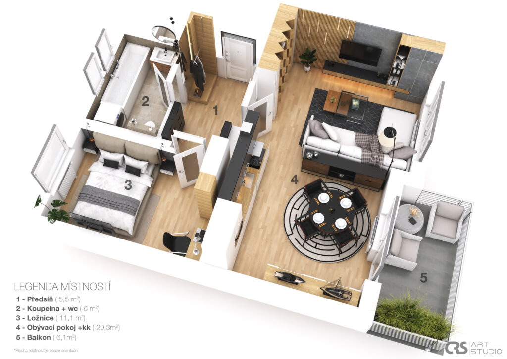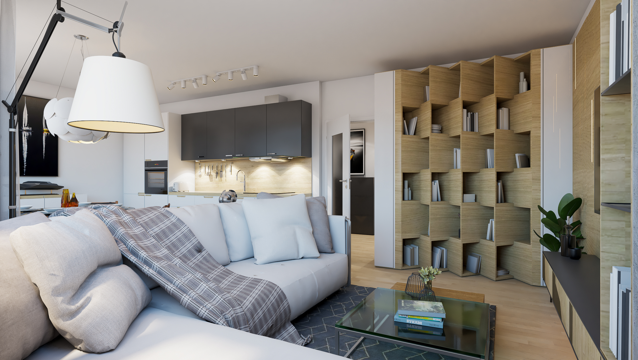 Takto pěkný byt se málokdy vidí. Má ideální velikost a orientaci – obývací pokoj s kuchyňským koutem a balkonem je orientovaný na jih, zatímco ložnice a koupelna jsou na sever. Je umístěn v klidném místě, ale přitom kousek do centra i přírody. Dům bude po dokončení velice pěkný s perfektně fungujícím Bytovým družstvem, o čemž svědčí ukázkový vzhled domu už před výstavbou.